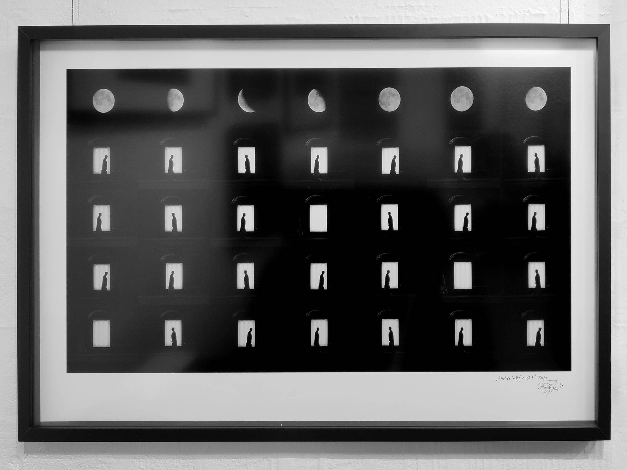 Drégely Imre - Holdalatti c. fotográfiája. Fekete-fehér fotónyomat archÃv barit fotópapÃron, vitrinkeretben.