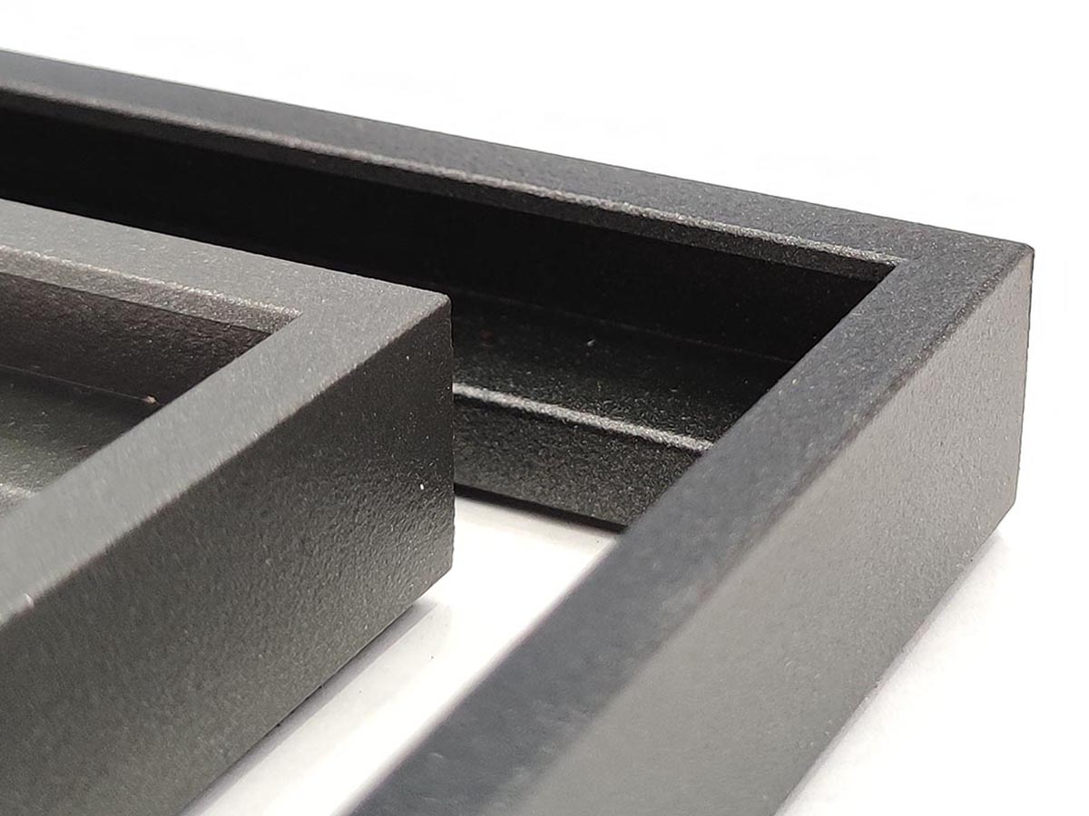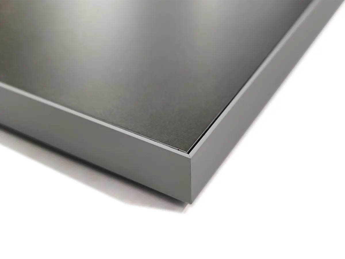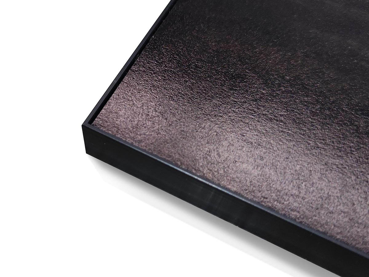 Szemből nézve szinte nem is látható, hogy a kép be van keretezve. A keret éle csak 1 mm vékony, így a kép látványát nem befolyásolja. Elegáns, modern képkeretezési megoldás a Dibond lemezre kasírozott nyomatokhoz.